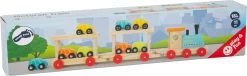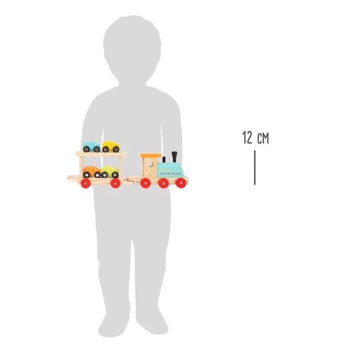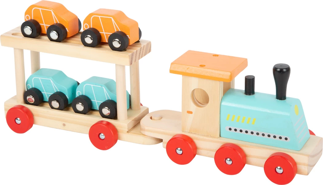 Tut tuuut – Autos auf großer Reise! Dieser Autozug aus Holz bietet auf seinen zwei Waggons Platz für insgesamt 8 reisende Autos. Jeder Waggon verfügt über zwei Ebenen, auf denen die farbenfrohen Fahrzeuge in ihren Rillen sicher stehen. Beim An- und Abkoppeln sowie beim Ab- und wieder Aufladen trainieren kleine Lokführer spielerisch ihre Motorik.