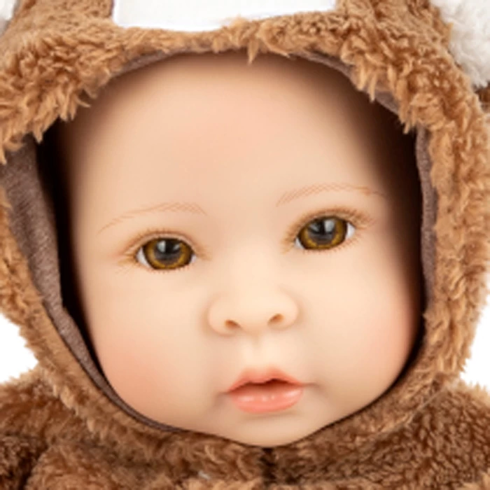 Schlaf Kindchen, schlaf! FĂŒr alle Puppenmamas und Puppenpapas ist diese sĂŒĂe Puppe im PlĂŒscheinteiler ein toller Kuschelbegleiter. Der niedliche Schlafanzug im TeddybĂ€r-Design lĂ€sst sich ganz leicht anziehen und durch die Druckknöpfe verschlieĂen. Der Kopf, die FĂŒĂe und HĂ€nde sind aus feinstem Formguss in KindergartenqualitĂ€t gefertigt und sind dadurch strapazierfĂ€hig. Durch die sanfte Kugelgewichtung im GesĂ€Ăbereich kann die Puppe auch aufrecht sitzen. Alles bereit fĂŒr die Nacht! So kann sich die Puppe samt Kuscheldecke und Schnuller ins Puppenbettchen legen! Schlaf gut!