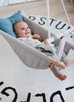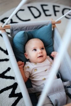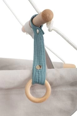 Der hohe sichtbarere Vollholzanteil, die natürlichen Materialien und die Trendfarbe Rauchblau machen diese Babyhängematte zum absoluten Hingucker! Für entspannte und zufriedene Babys genau das Richtige! Die abgerundeten Hölzer sorgen mit ihrer sanften Form für angenehme Haptik und hohe Sicherheit. Das herausnehmbare Kissen wird durch Schlaufen an der Schaukel befestigt. Ein Druckknopf sichert den Greif-/Beißring – weitere Accessoires wie Schnuller und Spielzeug können zusätzlich befestigt werden.