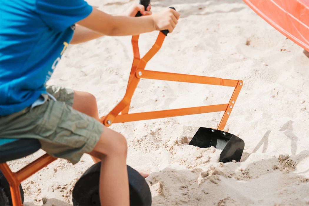 Dieser Metallbagger mit großen Kunststoffrädern (Ø 20 cm) ist der Hit für kleine Baumeister! Drehbar um 360° und mit dem tollen Schalensitz ist der stabile, aber leichte Bagger das ideale Spielgerät im Sandkasten!