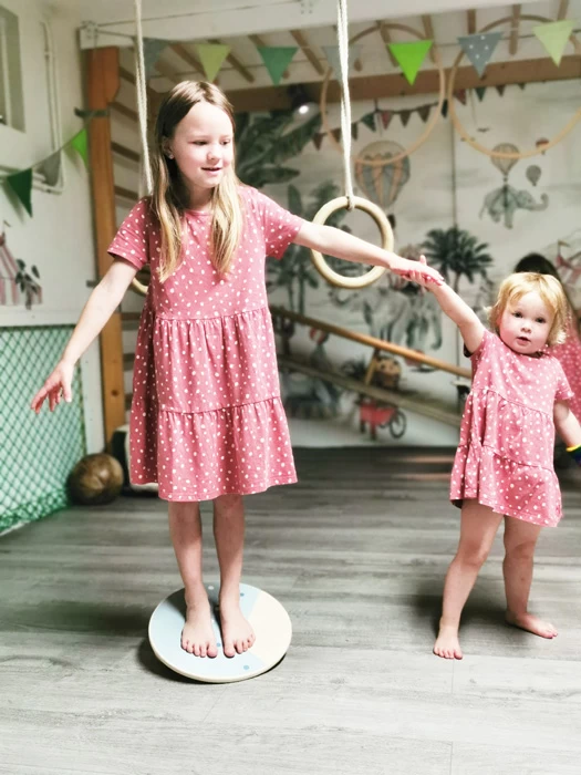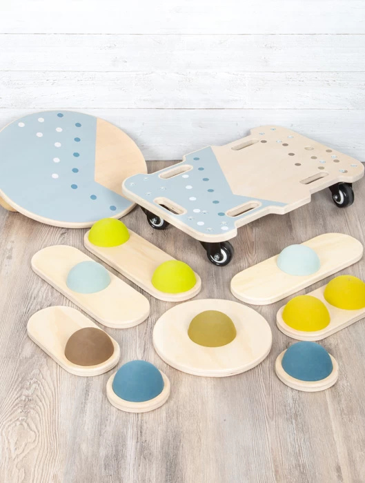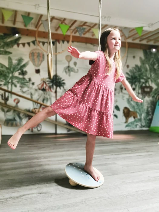 Es kann entweder eine der beiden Holzkugeln mittig oder seitlich versetzt auf der Unterseite eingeschraubt werden. Alternativ werden beide Holzkugeln an den äußeren Einschraubmöglichkeiten befestigt – so kann das Balanceboard an Können und Alter der Kinder angepasst werden. Besonders praktisch: Das Balancierbrett ist einzeln nutzbar oder kreativ einsetzbar als Teil eines ganzen Parcours aus Bewegungsspielzeugen der Linie „Adventure“. Durch die schlichte Gestaltung, die simple Formgebung und viel naturfarbenes Holz passt sich das Brett jeder Wohn- und Kinderzimmerumgebung optimal an! Auch für Therapiezwecke geeignet!