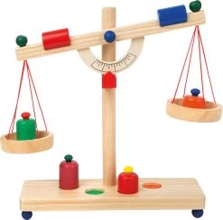Aus Massivholz gefertigt und mit vier bunt lackierten Gewichten ein unverzichtbarer Bestandteil für kleine Kaufleute! Auf dem Balken sind zwei schiebbare Ausgleichsgewichte zum Justieren der Waage – so wird jeder Wiegevorgang zum „Handwerk“!