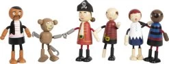Hier kommt die mutige Piraten-Crew für das berüchtigtste Seeräuberschiff aller Weltmeere! Bestehend aus der Kapitänin mit Hakenhand, ihren vier Crew-Mitgliedern und einem niedlichen Äffchen, verspricht diese biegsame Freibeutergruppe fantasievollen und realitätsnahen Spielspaß für jedes Piratenschiff im Kinderzimmer. Äußerst flexibel, strapazierfähig und detailreich gestaltet, lassen sich die Biegepuppen aus Holz dank ihrer Arme und Beine aus textilummanteltem Draht in verschiedenste Positionen bringen. Für die Extraportion Spielspaß sorgt der Affe, der sich mit seinen Hakenhänden und der Hakenschwanzspitze überall festhalten kann.