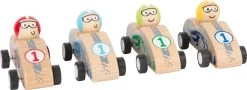 8 Stück. Auf die Plätze, fertig, los! Die Rennautos aus lasiertem Holz in vier verschiedenen Farben sehen mit den niedlichen Rennfahrern nicht nur witzig aus, sie versprechen auch rasanten Fahrspaß. Dafür sorgt die klassische Rückzieh-Mechanik.