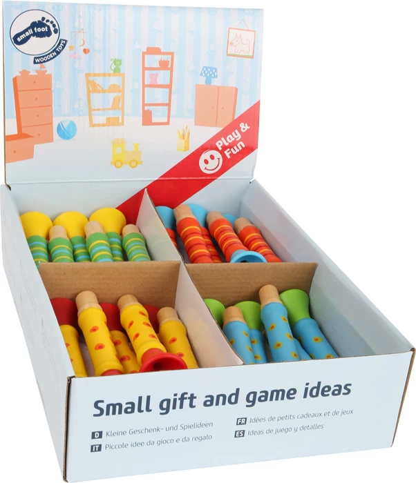 Die Trompeten liegen gut in der Hand und machen kleinen und großen Kindern Spaß am Klang. Im verkaufsfördernden Display an der Verkaufstheke aufgestellt, sind sie ein toller Mitnahmeartikel. Musikalische Früherziehung im Kleinformat: Die bunten Trompeten!