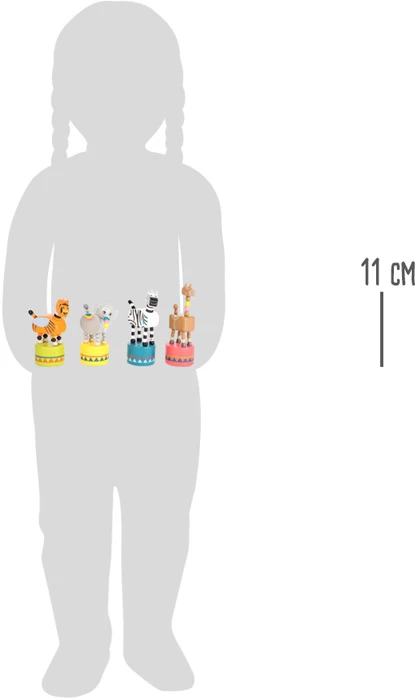 12 Stück. Lasst die Wildtiere tanzen! Lama, Elefant & Co stehen auf ihren Podesten und warten nur darauf, bewegt zu werden. Einfach unter das Podest drücken und es entstehen lustige und immer wieder neue Bewegungen und wilde Tänze. Durch das farbenfrohe Design sind die Drücktiere aus FSC® 100%-zertifiziertem Holz als Deko- und Sammelartikel sehr beliebt.