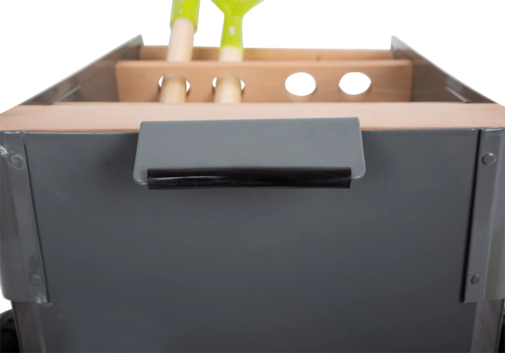 Für ein Extra an Sicherheit für die kleinen Gärtner sorgt die durchdachte Gestaltung und Ausrichtung des Stauraums für die großen Gartengeräte! Spaten, Rechen, Schaufel und Co. werden so platziert, dass sie vom Kopf und Gesicht des Kindes weg zeigen und so Verletzungen verhindern.