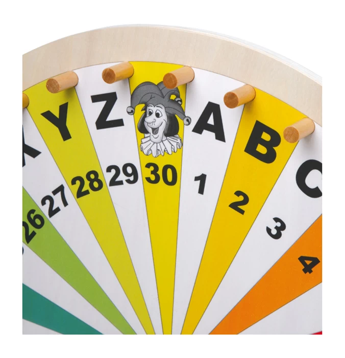 Ein tolles Zubehör für Lotteriespiele, Wortspiele oder erdachte Spiele ist dieses Glücksrad mit Ziffern von 1 bis 30, Buchstaben von A bis Z und vier Jokern! Auf dem standsicheren Massivholzständer kann das Rad sich gut drehen und die einzelnen Felder sind mit Holzstiften versehen, welche fröhlich an dem „Stopper“ klappern.