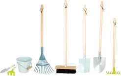 Dieses umfangreiche Gartenwerkzeug-Set in modernen Farben besteht aus Spaten, Schaufel, Rechen, Harke, Besen, Eimer und zwei kleinen Gartengeräten und bietet für jede Tätigkeit das passende Equipment. Nach der Arbeit können die Werkzeuge aus robustem Holz und Metall an den praktischen Schlaufen ordentlich aufgehängt werden.
