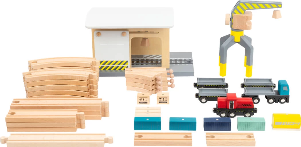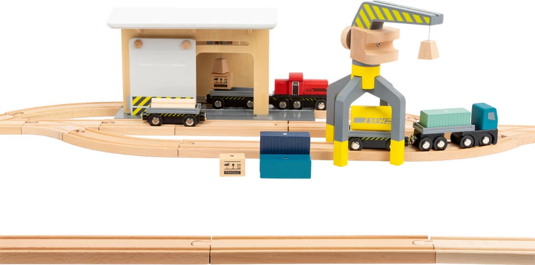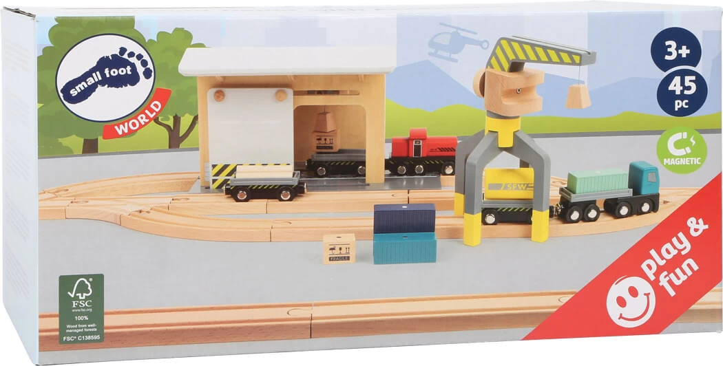 Dieser Güterbahnhof aus FSC® 100%-zertifiziertem Holz hält mit zahlreichen Spielmöglichkeiten auf Trapp. Mit dem Spielset können Eisenbahnfans die Arbeiten auf einem Güterbahnhof nachspielen und sich in punkto Schienenführung mit insgesamt 25 Schienen kreativ austoben. Magnetische Holzbauklötze im Frachtgut- und Containerdesign, ein um 360 Grad schwenkbarer Kran und Fahrzeuge mit magnetischen Anhängern komplettieren das Set.