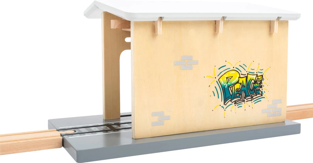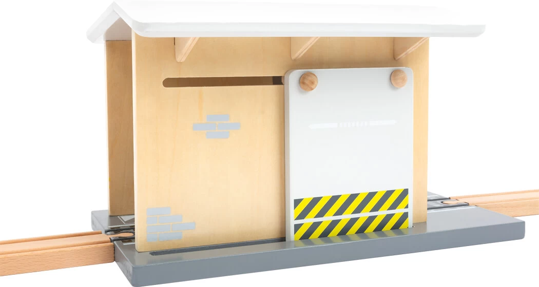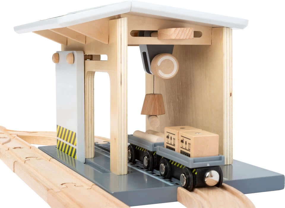 Die verschiebbare Wand am Bahnhofsgebäude mit integriertem Flaschenzug bietet Flexibilität für verschiedenste Verladesituationen. Welche Güter befinden sich in der nächsten Lieferung? Das Spielset ist mit allen gängigen Schienensystemen kompatibel.