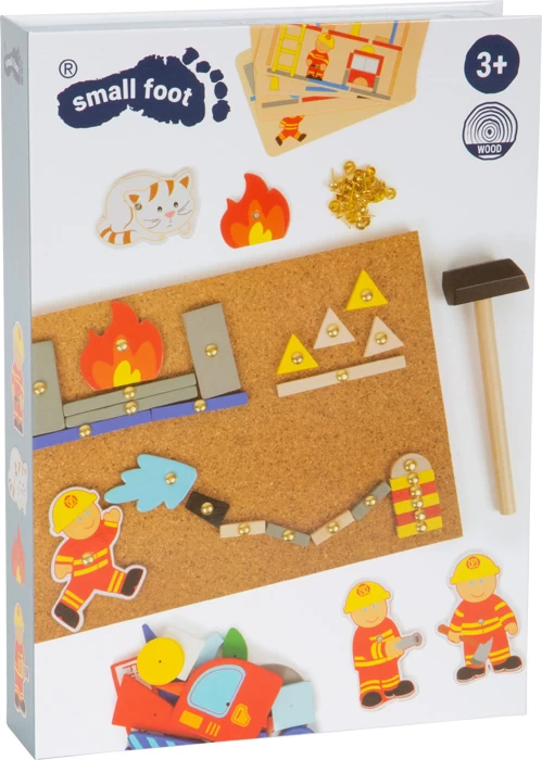 Tatü tata! Mit diesem Hämmerchenspiel kann jedes Kind seine individuelle Feuerwehrstation zusammenstellen. Durch die vorgefertigten Löcher in den Puzzleteilen aus Holz und Pappe lassen sich die Ziernägel ganz einfach mit dem Holzhammer in die Korkplatte schlagen. Inkl. Schachtel.
