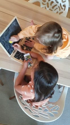 Ein Holz-Laptop für die Kleinen. Die Buchstaben, Satzzeichen und Zahlen sind magnetisch – so lassen sich ganz leicht erste Wörter und Matheaufgaben auf der Magnettafel befestigen. Mit der Kreide sind flink ein paar Bilder und Worte auf den „Bildschirm“ gemalt. Das Schwämmchen wischt alles wieder weg. Ein zeitgemäßes Smartphone aus Holz rundet dieses tolle Lernspiel ab.