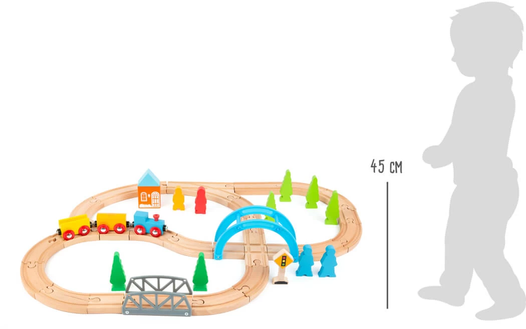 Eine Eisenbahnwelt für kleine Entdecker! Mit diesem Eisenbahn-Set aus Holz inkl. umfangreichem Zubehör-Set kommen kleine Eisenbahner voll auf ihre Kosten. Hier fährt die Eisenbahn über Brücken und durch Täler und schlägt durch die verschiedenen Gleisabzweigungen immer wieder einen neuen Weg ein. Die Holzschienen sind mit allen handelsüblichen Schienen kompatibel.