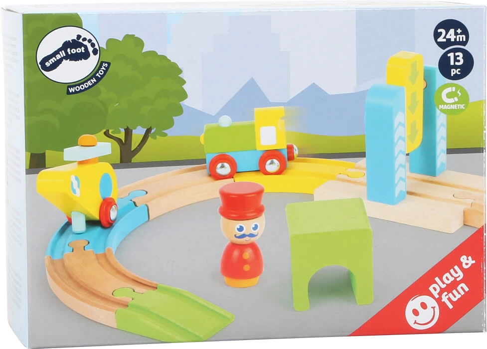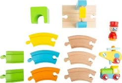 Bunter Eisenbahn-Spaß für die Kleinsten! Dieses 13-teilige Eisenbahnset aus Holz beeindruckt kleine Eisenbahner mit bunten Schienenelementen, einer Lokomotive und einem Hubschrauber. Für eine sichere Landung sorgt eine Landefläche und der Schaffner regelt den Zugverkehr. Die Schienen sind mit allen handelsüblichen Schienensystemen kombinierbar.