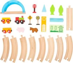 | Inhalt | 1 Lok, 2 Waggons, 1 Brücke, 2 Tiere, 3 Verkehrsschilder, 9 Schienen, 2 Bäume, 2 Gebäude, 2 Dächer |