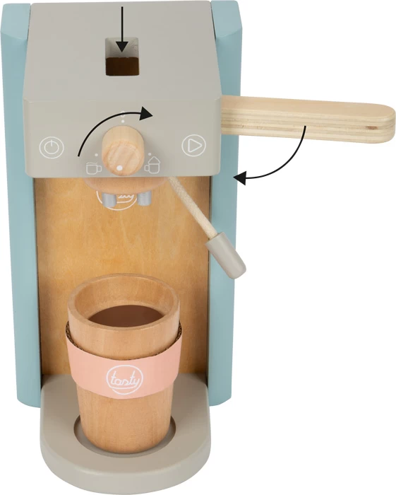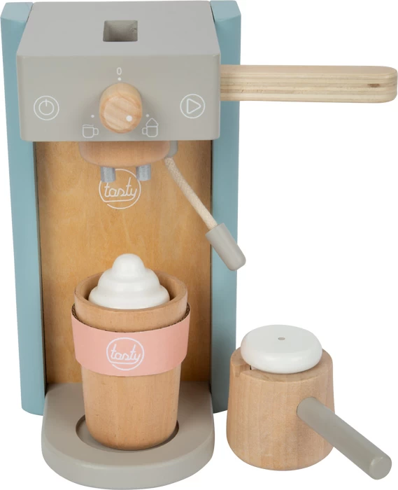 Ein farblich perfekt auf die Kinderküche kompakt „tasty“ (12216) abgestimmtes Set! Die Kaffeemaschine kann oben mit einem Kaffeecoin bestückt werden, der beim Betätigen des Hebels durch den Schlitz in den Becher fällt. Die konische Form der Kaffeecoins sorgt dafür, dass der Coin immer waagerecht in den Becher fällt. Der magnetische Milchschaum kann mit dem Milchkännchen abgenommen und auf die Becher umgefüllt werden. Der „Milchschaumschlauch“ ist ein mit Stoff ummantelter, in alle Richtungen biegsamer Draht, an dessen Ende per Magnet ein Milchschaumhäubchen befestigt wird. Die ausgewogene Gestaltung und moderne Farbgebung passt sich besonders dezent in moderne Kinder- und Wohnzimmerambiente ein.