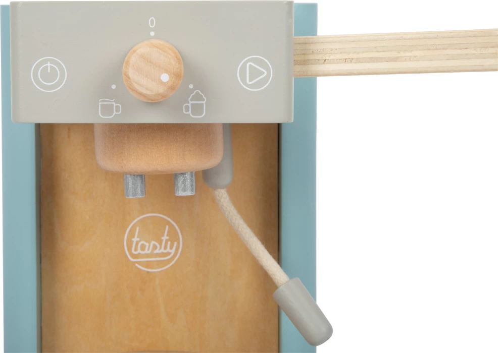 Für die Barista der Kinderküche! Dieses Komplett-Set aus Holz umfasst neben der modernen Kaffeemaschine zwei Kaffeecoins und Coffee-to-go-Becher, eine Zuckerdose mit Deckel/Löffel sowie ein Milchkännchen mit Milchschaumhauben. Für realistischen Spielspaß sorgen die Kaffeecoins, die in die Becher fallen und mit dem magnetischen Milchschaum stilecht verziert werden! Dezente Farben wie helles Rauchblau, Weiß und viel naturbelassenes Holz machen dieses Küchenset zum Hingucker!