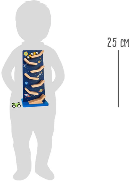 Mit Lichtgeschwindigkeit durch die Umlaufbahn! Dieser Kaskadenturm aus Holz im Weltraum-Look sorgt bei kleinen Astronauten für ungebremsten Spielspaß, wenn die beiden Spaceshuttles die Rennbahn hinunter sausen und dabei lustige Purzelbäume schlagen.