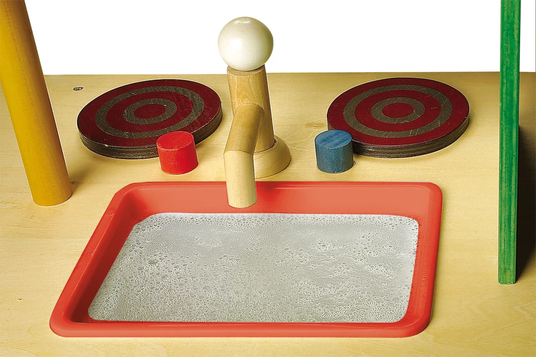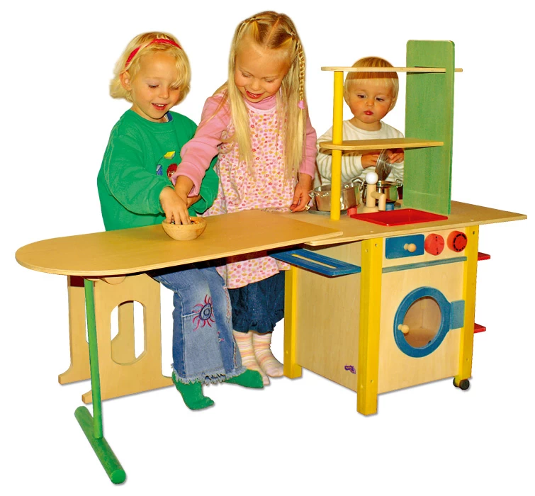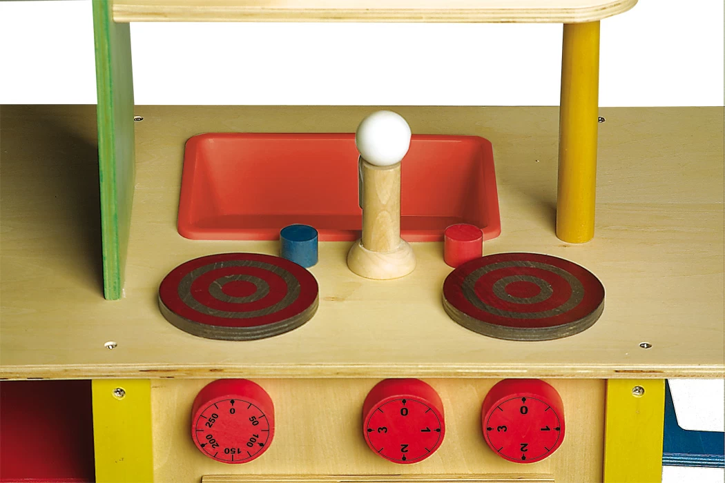 Hoher Spielwert durch viele Variationen. Mit Waschmaschine, Herd und Spüle. Zusätzliche Anhängevorrichtung für Küchenzubehör und Geschirrspültuch. Mit Reglergeräuschen und Klappen mit Magnetverschluss.