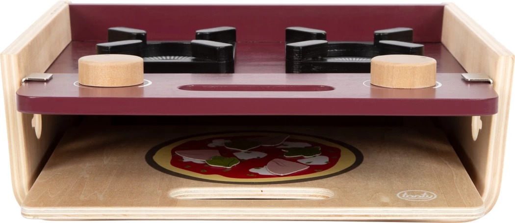 Grundlage für vielfältige Spielideen bieten 2 Pappbögen, aus denen Lebensmittel/Zutaten ausgestanzt und zubereitet werden können. Mit Küchenhandtuch, Pfanne, Topf mit Deckel, Grillzange und Pfannenwender aus Holz sowie beidseitig bedrucktem Backblech, das zum Pizzabacken oder Grillen dient. Der Gasflammendruck auf der Unterseite imitiert den Grill. Küchenfront mit Drehknebeln wie bei echten Campingkochern. Nach dem Kochen verwandelt sich die kleine Küche durch einfaches Umdrehen und Aufstecken des Wasserhahns ruckzuck in ein Spülbecken. Besonders praktisch: Alle Teile finden nach dem Spielen im Küchenkoffer Platz und sind unterwegs immer sicher verstaut.