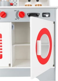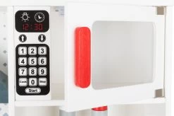 Wer bekommt da nicht Lust zu kochen? Mit dieser umfangreich ausgestatteten Spielküche wird jedes Kind zum Sternekoch im Kinderzimmer. Durch die integrierten Sound- und Lichteffekte im Kochfeld und die verschiedenen Kochutensilien aus Holz wirkt die Küche sehr realitätsnah. Mit Waschmaschine, Ofen und Mikrowelle enthält die Küche alles, was zu einem modernen Haushalt gehört. Batterien nicht enthalten.