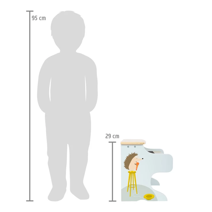 Wer begleitet Ida Igel am Klavier? Dieses stabile, elektronische Holzklavier überzeugt durch sehr gute Klangqualität und fröhliches Design. Mit einer Kombination aus viel naturbelassenem Holz, modernen Blautönen und kindgerechten Motiven ist dieses Piano auch optisch der absolute Hingucker für das Orchester im Kinderzimmer! Beiliegende Sticker, die auf die Tasten geklebt werden können, unterstützen kleine Musiker bei den ersten Liedern. Mit Notenblatt. Batterien nicht enthalten.