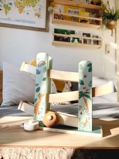 Mit Schwung durch die Wildnis! Auf dieser Kugelbahn aus Holz im angesagten „Safari“-Look rasen drei verschieden farbige und mit Mustern verzierte Holzräder die drei Rampen hinunter. Die Abfahrt ist mit Safari-Tieren und trendigen Blätter-Motiven detailreich verziert.