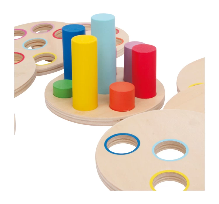 Genau schauen, überlegen, probieren und passend stecken – ein tolles Steckspiel zur Schulung der Motorik und der Hand-Augen-Koordination! Acht stabile Scheiben (1 cm stark) aus fein geschliffenem Schichtholz sollen auf die farbigen Stäbe gesteckt werden. Da die Stäbe unterschiedlich lang sind und jede Scheibe immer eine Öffnung weniger hat als die vorhergehende, gibt es zur Lösung nur einen Weg!