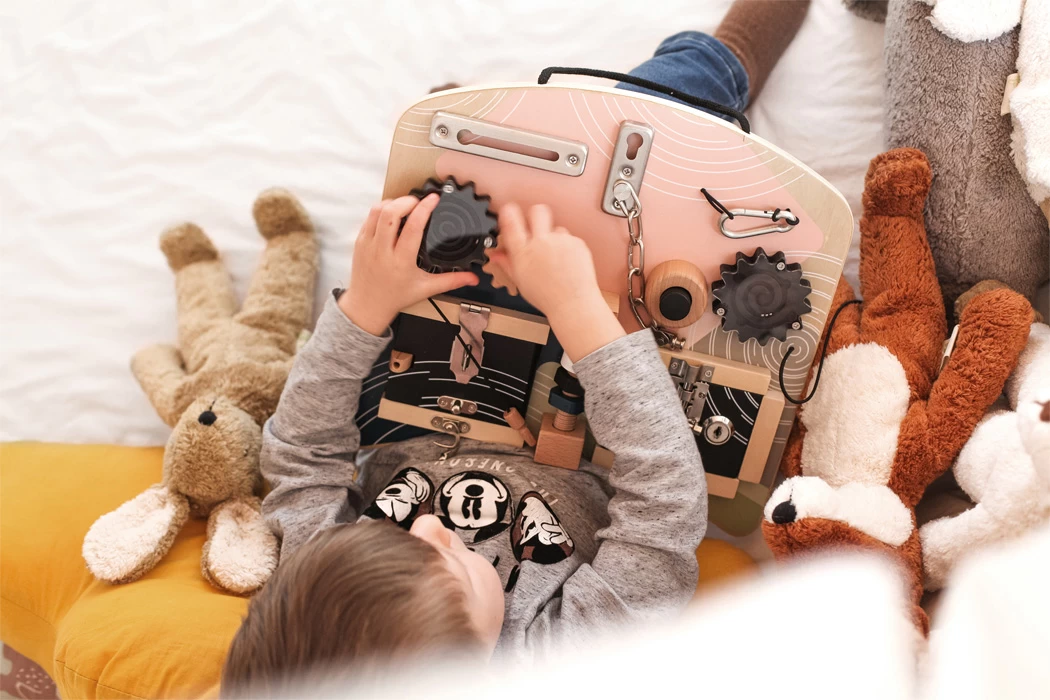 Abwechslungsreichen Spiel- und Motorikspaß bietet dieses Lernbrett aus Holz, das mit Schlössern und Drehspielen unterschiedlicher Ausführungen ausgestattet ist. Das Spielbrett in modernen Trendfarben und mit hohem sichtbaren Holzanteil eröffnet Kleinkindern eine Fülle an Spiel- und Beschäftigungsmöglichkeiten zur Förderung der feinmotorischen Fähigkeiten. Von Karabiner mit Schlinge über Türkette, Haspel-, Riegel- und Truhenschloss bis hin zum Zylinderschloss mit Schlüssel, bietet dieses Motorikbrett eine Vielzahl an Schlössern, die Kinder aus ihrem Alltag kennen und die spielerisch geübt werden können. Zusätzliche Features wie ein Zahnrad-Spiel mit Mini-Labyrinth oder eine Gewindestange mit vertikalen Drehelementen und eine Quietschhupe, runden das Aktivitätsboard ab.
