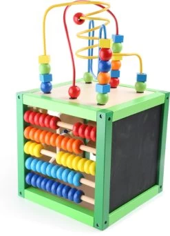 Mit einer Motorik-Schleife, dem Rechenschieber und der Zahlerkennungstafel, einem Schiebespiel zum Erkennen von logischen Abläufen und Zusammenhängen und einer Maltafel hat dieser Motorikwürfel alles, was die Kleinen für die ersten Lernversuche brauchen.