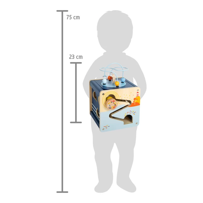 Mit zwei Motorikschleifen, Formen-Steckspiel, Schiebelabyrinth und Drehklappen-Spiel auf fünf bespielbaren Flächen ist dieser maritime Motorikwürfel aus stabilem Holz ein Alleskönner in punkto Spielen, Lernen und Entdecken! Der in modernen Farben mit hohem sichtbaren Naturholzanteil gestaltete Spielwürfel trainiert die Wahrnehmung von Formen und Farben, fördert Geschicklichkeit und Feinmotorik, verbessert die Hand-Auge-Koordination und regt die Fantasie an. Starke Farbkontraste sowie ein Spiegel regen Sehsinn und kindliches Selbst-Erkennen an. Der abnehmbare Deckel kann platzsparend im Würfel verstaut werden.