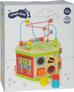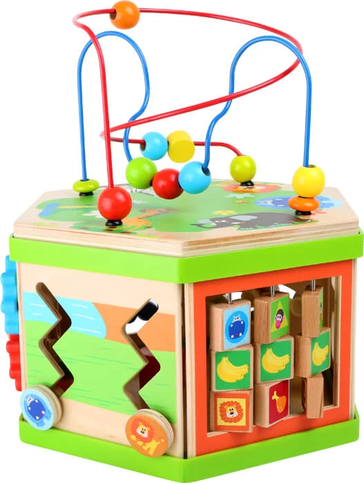 Dieser Motorikwürfel aus Holz bietet vielfältige Spielerlebnisse auf sieben Spielflächen. Ob Rechenschieber, Schiebespiel oder Motorikschleife, hier werden die Fein- und Grobmotorik und das spielerische Erfassen und Begreifen von Mengen erlernt. Neugier- und Entdeckerdrang werden hier gestillt und fördern auch die Hand-Augen-Koordination und die Kreativität der Kinder.