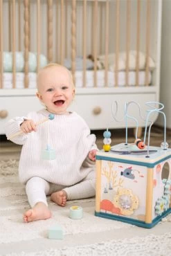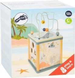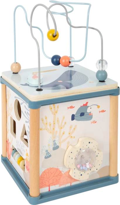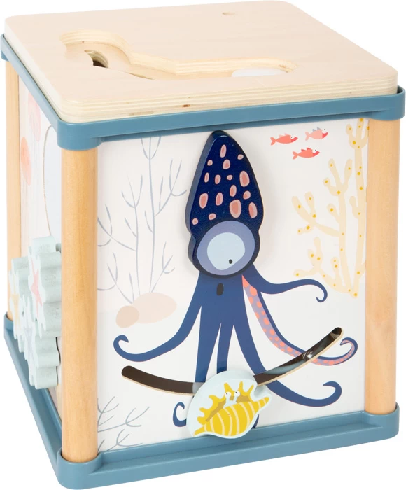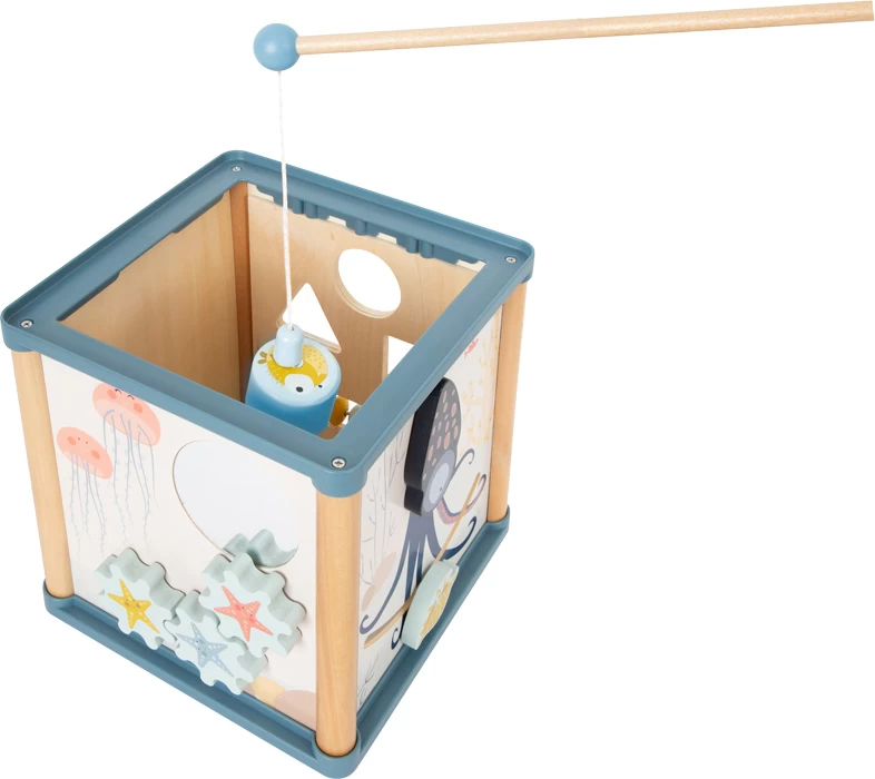 So viel los unter Wasser! Mit Motorikschleife, Formsteckspiel, Schiebelabyrinth, Zahnrad-Spiel sowie Rassel ist dieser Motorikwürfel aus Holz ein Multitalent auf fünf bespielbaren Seiten. Die liebevoll gestaltete Kulisse mit maritimer Unterwasserwelt animiert zum Geschichtenerzählen und lässt Kinder spielerisch die Welt der Meeresbewohner entdecken. Für die Extraportion Spaß sorgt der Oktopus, dessen Kopf dank Federmechanismus lustig wackelt. Auch das drehbare Bullauge mit bunten Rassel-Kügelchen und der Spiegel sind besondere Spiel-Highlights. Abwechslung bietet die mitgelieferte Angel, mit der die drei magnetischen Steckbausteine geangelt werden können. Ein großer Spaß für kleine Kinder, der gleichzeitig Motorik schult und Geduld fördert.