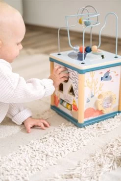 Der Motorikwürfel Unterwasserwelt überzeugt durch die außergewöhnlichen und vielseitigen Spiel-Möglichkeiten, den hohen sichtbaren Holzanteil und die kindgerechte Gestaltung. Umgedreht lässt sich die Motorikschleife ganz einfach platzsparend im Motorikwürfel verstauen, sodass das Spielzeug gut in jedes Kinderzimmerregal passt.