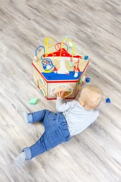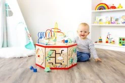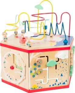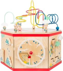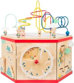 Spielspaß im exklusiven small foot Design! Dieser hochwertige Motorikwürfel aus FSC® 100%-zertifiziertem Holz überzeugt auf allen Seiten durch hohen Spielwert, denn für kleine Entdecker gibt es so viel zu erkunden: umklappbare Holztafeln im Memo-Stil trainieren das Zahlenverständnis, ein Suchspiel mit Igel, Marienkäfer und Vogel sorgt für Spaß und eine Jahreszeitenuhr verrät Wissenswertes über Frühling, Sommer, Herbst und Winter. Das Rädchenspiel mit Zahnrädern und ein Labyrinth komplettieren die Motorikwelt. Eine große Motorikschleife auf dem abnehmbaren Deckel krönt den Spaß. Der Clou: Der Motorikwürfel macht auch als Hocker oder Tisch eine gute Figur!