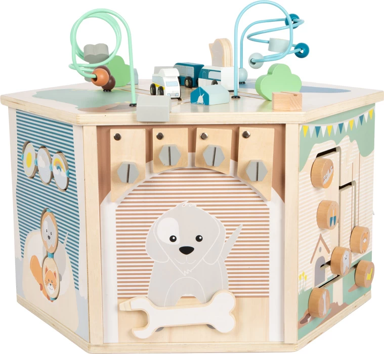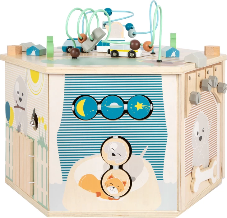 Auf 8 bespielbaren Flächen bietet dieser Spielwürfel langanhaltenden Spielspaß und vermittelt, was zu einem Leben mit Haustieren dazu gehört! Motorische Fähigkeiten werden am Schiebelabyrinth, am Steckspiel, am Drehklappen-Spiel und am abnehmbaren Fädel-/Farbsortierspiel trainiert – optisch immer in Verbindung mit dem Alltag der Tiere! Das Konstruktionsspiel mit Schrauben und Werkzeug fördert Geschick, Türklingel/Tor-Ratsche sorgen für akustische Reize. Highlight ist der wendbare, werkzeuglos fixierbare Deckel mit Kreidetafel, der auf der Rückseite mit Motorikschleifen und Schienen zum Campingausflug einlädt. Tipp: Deckel auch als Maltisch/Bodenspielplatte nutzbar!