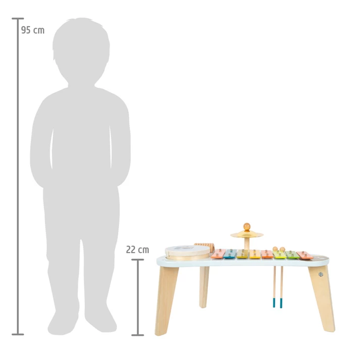 Ein motivierender All-in-One Musik- und Lernspaß! Optisch besticht der Musik- und Klangtisch durch sein fröhliches Design und der harmonischen Kombination aus naturbelassenem Holz und modernen Blautönen! Die Instrumente trainieren neben der akustischen Wahrnehmung auch spielerisch Rhythmus- und Taktgefühl und ein erstes Verständnis für Töne.