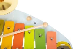 Bruno Bär macht Musik! Dieser stabil konstruierte, auf drei Füßen stehende Musiktisch animiert Kinder dazu, mit Becken, Xylophon, Ratsche und der abnehmbaren Trommel vielfältige Klang-Erfahrungen zu sammeln. Die Klangstäbe des Xylophons sind farbkodiert – so gelingen erste Lieder kinderleicht! Mit robusten Vollholzschlägern und beiliegendem Notenblatt.