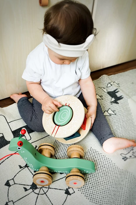 Schnell, kleine Schnecke! Diese Ziehschnecke aus Holz mit elastischen Fühlern, freundlichen Augen und gummierten Rollen animiert zum Laufen lernen. Beim Nachziehen dreht sich das abnehmbare Schneckenhaus und lässt die Stecksteine im Inneren klackern. Die Steine können am Gewinde auf der zweiten Seite des Schneckenhauses angeschraubt werden – dank farblicher Markierung wird zusätzlich die Farb- und Formerkennung geschult. Der Mix aus naturbelassenem Holz und moderner Farbgebung, macht das Ziehtier zum absoluten Hingucker!