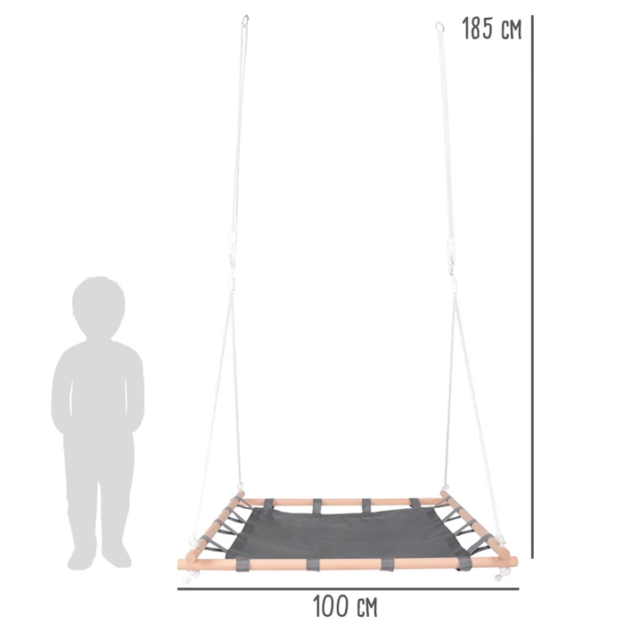| Maße cm | Seil Länge: ca. 185 cm, Schaukel ca. 100 x 100 x 6,5 cm, max. Belastbarkeit 100 kg |