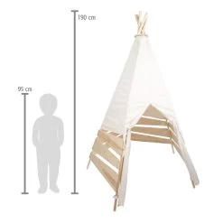Ein Spielzelt aus Holz für echte Outdoor-Fans! Dieses geräumige Außenspielzelt aus robustem Holz und wasserfestem Zeltstoff bietet kleinen Abenteurern Schutz vor Sonne, Wind und Regen – vor allem aber einen perfekten Unterschlupf und Rückzugsort für kreative Spielstunden im Garten! Das moderne Spielzelt für Draußen bietet viel Platz im Innenraum und hält durch sein raffiniertes Design mit verdrehter Stabkonstruktion und der soliden Holzbasis auch wildesten Spielsituationen zuverlässig Stand. Das Zeltoberteil lässt sich dank Klettverschlüssen besonders schnell und einfach befestigen. Mit Zeltöffnung zum Aufrollen – auch als Vorhang nutzbar, der sich mit Klett seitlich fixieren lässt.
