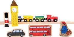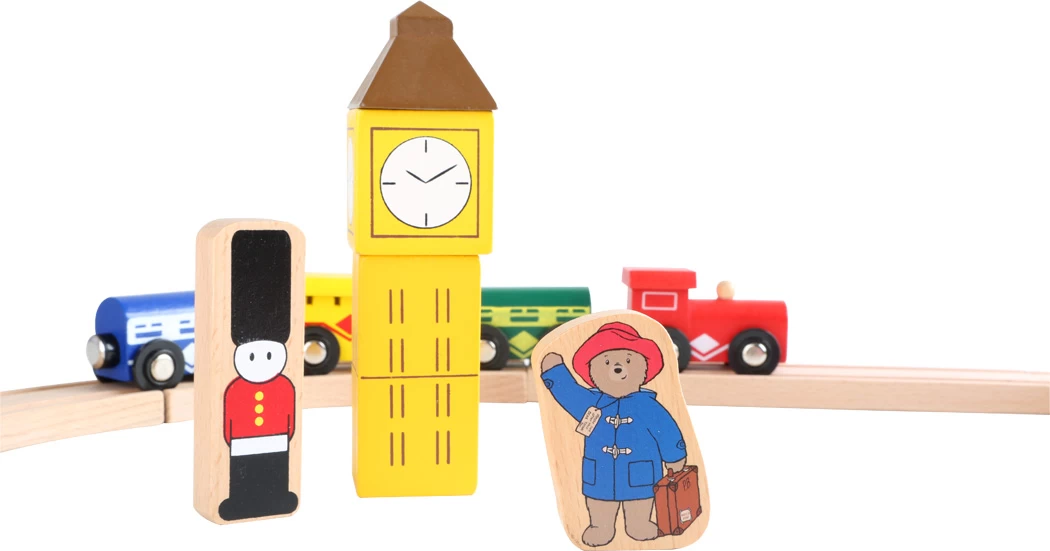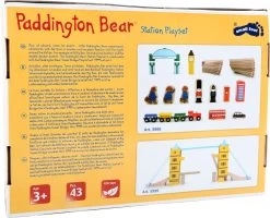 Alles einsteigen, TĂŒren schlieĂen! Paddington geht auf groĂe Reise. Dieser tolle Bahnhof ist ausgestattet mit Holzschienen und einer Bahnhofshalle. Auch verschieden bedruckte Holzaufsteller der englischen Hauptstadt, wie der Big Ben, eine rote Telefonzelle oder der rote Sightseeing-Bus sind abgebildet. Und zu guter Letzt darf natĂŒrlich der Zug nicht fehlen, der Paddington hinaus in die Welt bringt.