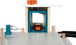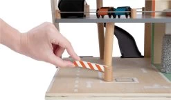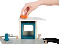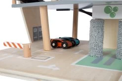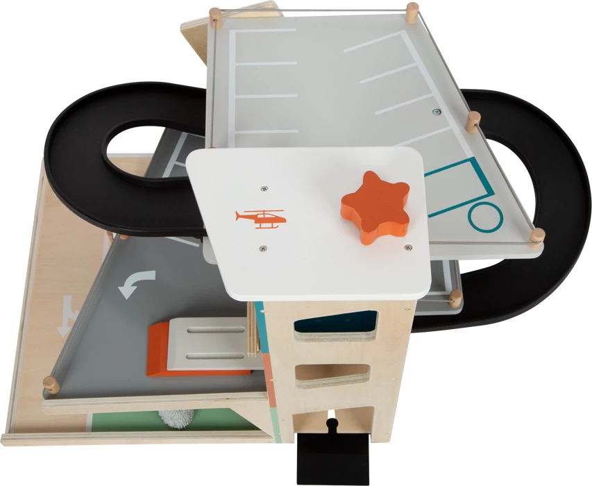 Hier geht’s rasant zu! Parken, tanken, waschen, reparieren – und dann pfeilschnell die Rampen des Parkhauses runter sausen! Die mattierte Oberfläche der Rampen sorgt für einen authentischen Asphalt-Look. Auf drei Ebenen können die beiden mitgelieferten Autos in der Garage geparkt werden, wenn sie nicht gerade an der magnetischen Benzin-Zapfsäule oder der Elektroladesäule vollgetankt werden. In der Autowerkstatt mit höhenverstellbarer Hebebühne wird nochmal alles gecheckt, bevor es für die kleinen Flitzer durch die Waschanlage mit beweglichen Walzen geht! Der Fahrstuhl zwischen den Parkhausebenen wird über ein großes Handrad bedient – ein Feststellmechanismus und Bodenrillen sorgen dafür, dass die Autos sicher nach oben gelangen. Die flexible Gummibegrenzung eignet sich als Katapult für die Autos. Mit Helikopterlandeplatz auf dem Dach des Aufzuges!