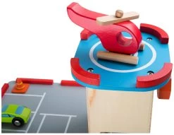 Riesengroßer Spielspaß auf drei Etagen. In diesem Parkhaus aus Holz ist richtig was los. Ein stufenloser Fahrstuhl mit Kurbelantrieb bringt die Autos hinauf und auf den Rampen sausen sie wieder hinunter. Der Hubschrauberlandeplatz bietet Platz für einen Helikopter, der für jeden Einsatz bereit steht. Für den nötigen Antrieb steht eine Zapfsäule bereit. Ampeln sowie Straßenschilder sorgen für Ordnung.