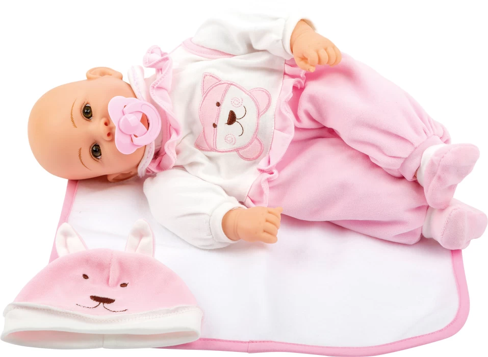 Zum Heulen süß ist unsere kleine Puppe „Emilia“ mit ihrer Wolfsmütze und passendem rosa Strampler. Schmusedecke und Fläschchen hat sie dabei und kann sofort bei kleinen Muttis und Vatis einziehen.