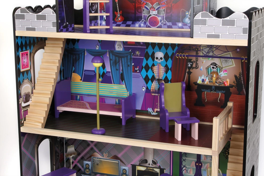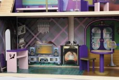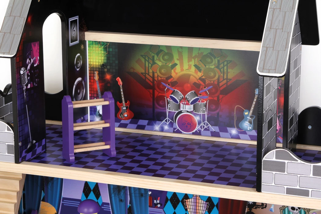Schaurig schönes Puppenhaus mit bunten Motiven an den Wänden beschert dem Spieler eine wohlige Gänsehaut! Auf drei Etagen finden Püppchen ihr neues Zuhause! 8 Möbelstücke aus lackiertem Holz sind schon enthalten aber es ist noch Platz für weiteres Mobiliar vorhanden.