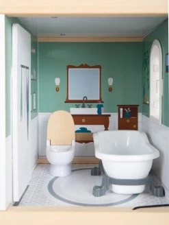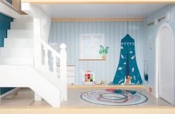 Dieses große Holz-Puppenhaus mit drei Etagen und offener Front überzeugt durch detailreiche Gestaltung und moderne Farbgebung. Wohnküche und Wohnzimmer, Kinderzimmer und Bad sowie Schlafzimmer und Loggia bieten viel Freiraum für fantasievolles Spielen. Treppen, eine Schiebetür, zu öffnende Fenster, Nachtkästchen mit Schubläden und eine echte Glocke, mit der sich Besuch ankündigt, machen zusammen mit den 12 Möbelstücken und vielen Accessoires den Spielspaß perfekt.