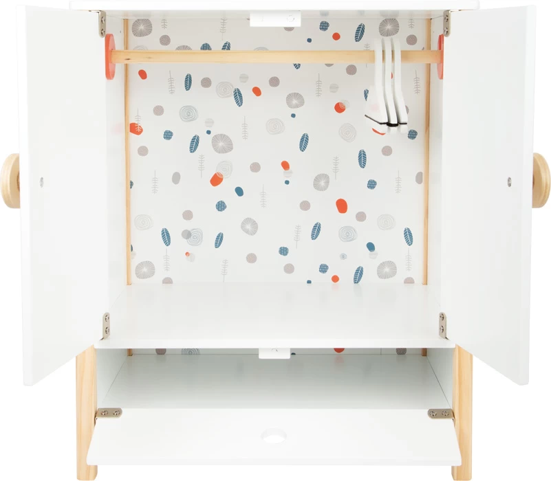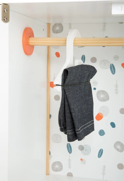 Alle Puppenkleider griffbereit! Dieser geräumige Kleiderschrank aus Holz punktet mit leichtgängigen Flügeltüren, skandinavisch-schlichtem Design und dezenten Gestaltungselementen! Kleiderstange und Staufach mit Klappe sorgen für Ordnung bei der Puppenkleidung. Die multifunktionalen Kleiderbügel helfen dabei, Kleinteile wie Puppenschuhe und Tücher mit Hilfe eines Gummibandes kinderleicht zu verstauen. Auch breitere Bügel finden dank der Schranktiefe bequem Platz.