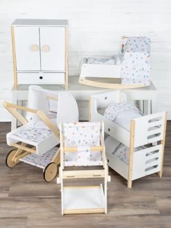 Ein modernes Puppenmöbelstück mit sichtbaren Vollholzelementen, das sich perfekt ins Kinderzimmer einfügt. Beim „Puppen-Spiel“ wird das Sozialverhalten kleiner Puppeneltern geschult und sie lernen ganz nebenbei, Ordnung zu halten. Eine stilvolle Spielergänzung fürs Kinderzimmer in hochwertiger Verarbeitung!